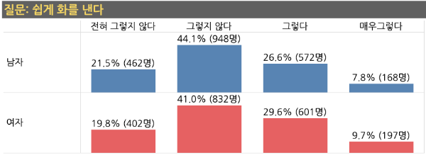 연령별 답변을 보니 나이가 어릴수록 상대적으로 더 쉽게 화를 낸다고 답한 비중이 높습니다.