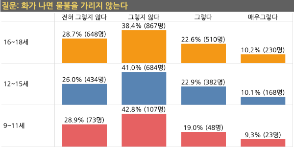 위에서 화가 쉽게 난다에 대해서 1/3이 긍정의 답을 했는데요, 화가 나면 물불을 가리지 않는다고 답한 청소년이 그중에는 없었으면 좋겠네요.